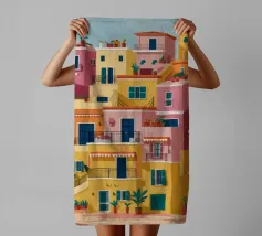 Una ripida scalinata colorata funge da strada in una città mediterranea, fiancheggiata da edifici di colore giallo, arancione e rosa, ornati da piante verdi in vaso.