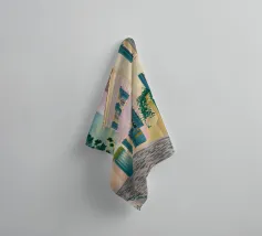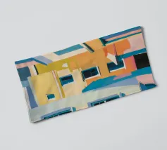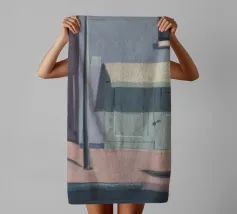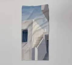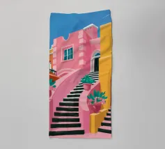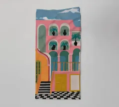 Una complessa scena urbana è resa con un'attenzione particolare alle forme geometriche e a un'audace tavolozza di colori rosa, verde acqua e rosso. Una scala esterna fornisce un forte elemento compositivo, guidando l'occhio attraverso le forme architettoniche astratte.