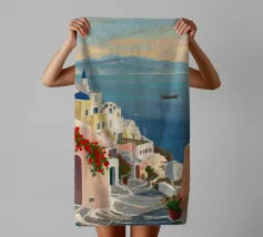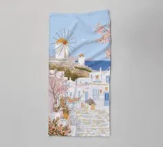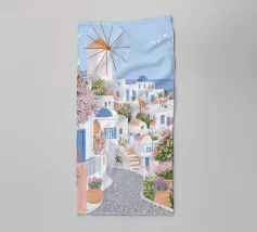 L'immagine mostra un idilliaco paesaggio costiero con case imbiancate a calce, porte e finestre blu e tetti color arancio, che si adagiano come terrazze su una scogliera rocciosa. Sullo sfondo svetta un mulino a vento, mentre il mare blu intenso luccica sotto un cielo limpido. Una vegetazione rigogliosa e fiori colorati costeggiano i sentieri. Lo stile è pittoresco e romantico, ispirato all'architettura mediterranea - in particolare all'isola greca di Santorini - e trasmette tranquillità, calore e bellezza senza tempo.