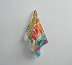 Una pittoresca illustrazione degli iconici edifici bianchi e delle cupole blu di un'isola greca, probabilmente Santorini, affacciata sul mare. La scena è una perfetta rappresentazione, inondata di sole, di un paradiso mediterraneo.