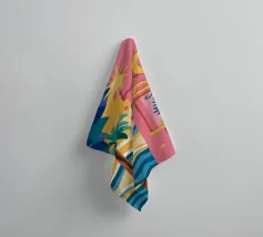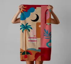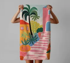 Scale rosse e vivaci conducono verso l'alto passando davanti a una finestra che rivela un cielo soleggiato, una palma e un sole splendente, a simboleggiare un viaggio verso una destinazione gioiosa.