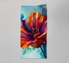 Una ripresa macro cattura i dettagli intricati di un fiore di papavero. Il fiore presenta petali viola, un centro rosso e un pistillo verde. Gli stami arancioni circondano il centro. Lo sfondo è di un blu scuro sfocato. L'immagine mette in evidenza le trame delicate e i colori vivaci del fiore.