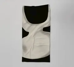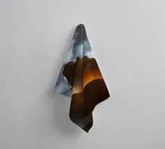 Una rappresentazione monocromatica presenta una forma accartocciata che ricorda in qualche modo una montagna o una formazione rocciosa. Le ombre e le lumeggiature sono state utilizzate per dare alla forma un aspetto tridimensionale, e poggia su uno sfondo più scuro che ne esalta la silhouette.