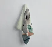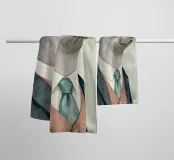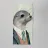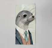Ritratto realistico ad acquerello di una foca aggraziata vestita con un abito scuro, un gilet color ruggine e una cravatta a righe verde acqua su un morbido sfondo color menta pastello.