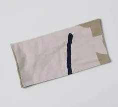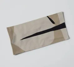 Una grande forma nera irregolare è posizionata al centro su uno sfondo più chiaro a contrasto, dall'aspetto ruvido e strappato. Il design è minimalista, con un'atmosfera astratta e una tavolozza di colori semplice.