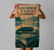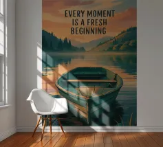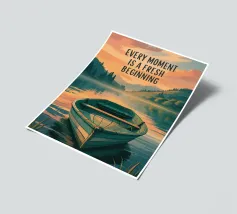 Abbracciate la tranquillità e la promessa di un nuovo giorno con questa splendida stampa d'arte. Caratterizzata da una tranquilla barca a remi che riposa su un lago calmo al sorgere del sole, circondata da dolci colline e da un vivace cielo pastello, questa opera è una rappresentazione visiva di speranza e rinnovamento. La citazione ispiratrice, "OGNI MOMENTO È UN INIZIO FRESCO", è splendidamente integrata nel design, rendendola un'aggiunta perfetta a qualsiasi spazio che desideri promuovere un'atmosfera positiva e riflessiva. Questa opera d'arte di alta qualità cattura la serena bellezza di un'alba, invitando a fermarsi, respirare e apprezzare le infinite possibilità.