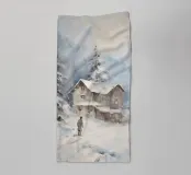 Un dipinto invernale pieno di tranquillità e di atmosfera: una singola figura si aggira per il sentiero innevato verso un'antica casa di montagna, circondata da maestosi abeti e da una leggera foschia montana. Le delicate tonalità di blu e la luce tenue conferiscono al quadro un'atmosfera pacifica e malinconica. Un omaggio alla solitudine e alla bellezza delle giornate invernali innevate.