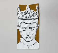 Un volto semplicistico e astratto è disegnato con linee nere decise e presenta una stella gialla sulla fronte. L'espressione è minimale, con piccoli punti per gli occhi e una linea retta per la bocca.