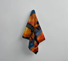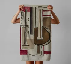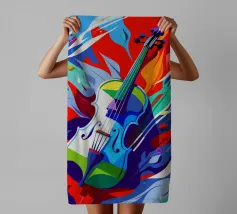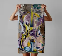 Un moderno dipinto astratto con forme geometriche che formano chitarre, violini e note musicali in una composizione audace e colorata. Lo sfondo strutturato e la disposizione dinamica evocano un senso di ritmo e di espressione artistica.