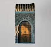 Tramonto su una facciata in Marocco. La luce del sole su una porta tradizionale in legno in Marocco. Arte, design e architettura marocchina a Meknes.