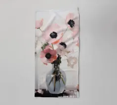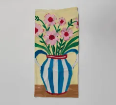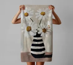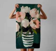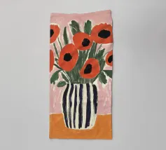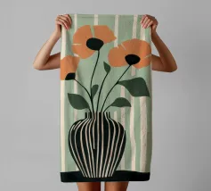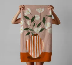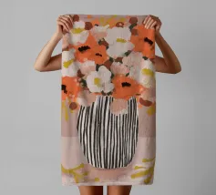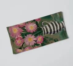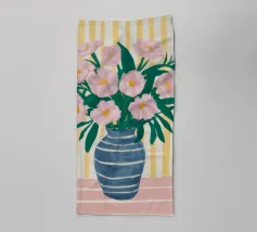 Questa illustrazione minimalista mostra un'elegante tazza di ceramica a righe bianche e nere, circondata da fiori rosa e foglie verdi. Sullo sfondo beige, l'allegro bouquet di fiori irradia leggerezza estiva e porta la freschezza botanica in ogni stanza!