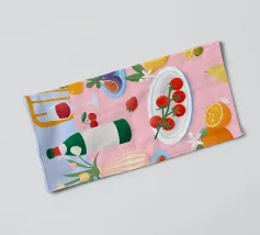 Vista dall'alto di un'insalata di pomodori freschi e di un bicchiere di vino su una tovaglia verde a righe all'aperto. La luce del sole e le ombre lunghe creano una scena vibrante, fresca e bella di una cena estiva.