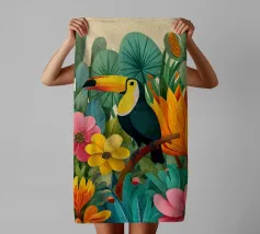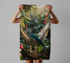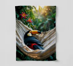Con il suo iconico becco e la sua posa rilassata, questo tucano sembra nato per la vita sull'amaca. Porta colore e calma, sia che lo appendiate in giardino che in un angolo soleggiato. Una stampa estiva che ricorda che anche il dolce far niente è un talento. Questa stampa fa parte della serie "Jungle Hammock Tales" - relax estivo con una strizzatina d'occhio. Questa illustrazione digitale è stata creata in stile fotorealistico, con un occhio di riguardo per la luce, i dettagli e l'atmosfera. Visualizzata da Trinkets NL Design Studio utilizzando l'AI.