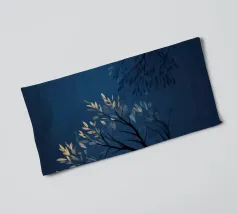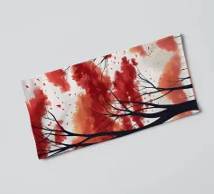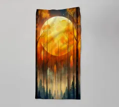 Il dipinto digitale di una foresta autunnale presenta sagome scure di alberi su uno sfondo caldo e dorato. L'opera d'arte testurizzata mostra un fogliame dettagliato nei toni dell'arancione e del marrone, creando una scena di bosco serena e suggestiva.