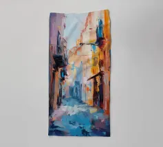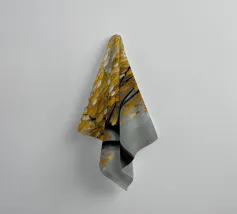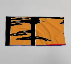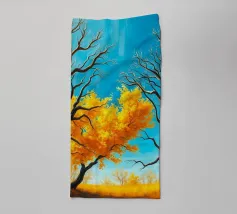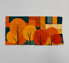 Una splendida rappresentazione astratta di una foresta autunnale con alti tronchi scuri e fogliame dorato. Lo sfondo caldo e luminoso esalta la composizione geometrica, creando un'atmosfera serena e moderna.