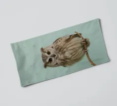 Un dipinto a olio di un gufo dall'aspetto simpatico e divertente. Si tratta di un uccello marrone chiaro con grandi occhi arancioni. Gli occhi del gufo sono un po' irregolari, il che lo fa sembrare ancora più buffo e dolce. Sembra anche un po' spaventato con i suoi occhi rotondi.