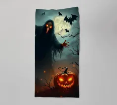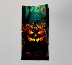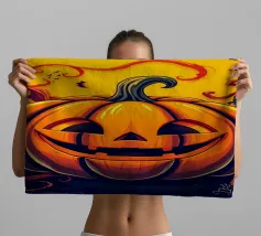 Al calare del crepuscolo, una strega in silhouette vola a cavallo della sua scopa tra i pipistrelli, con una zucca incandescente in primo piano, creando un'atmosfera incantevole.