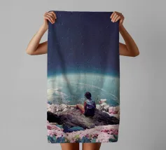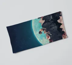 Vivevamo lì. Ricordate? Quel mondo ci sta ancora aspettando. ~ Coppia seduta su una panchina che guarda la Terra surreale retro futuristico stellato composizione romantica. versione orizzontale