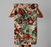 "I motivi e i disegni di Burcu Korkmazyurek si trasferiscono perfettamente dalle radici della moda alle stampe su tela. I suoi realistici motivi floreali e animali si integrano o contrastano con sfondi che vanno dal"
