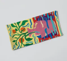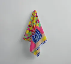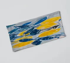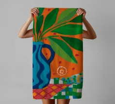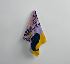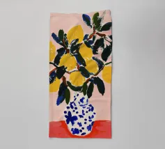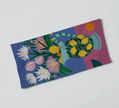 Un vivace bouquet di fiori e agrumi si trova in un vaso blu su un tavolo rosa. Lo sfondo è un mix dinamico di motivi a zig zag in bianco e nero e foglie verdi, che creano una natura morta moderna e giocosa.