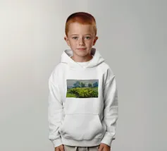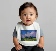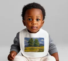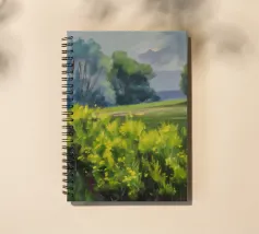 Un dipinto di paesaggio impressionistico che cattura un campo verde e lussureggiante, punteggiato da alcuni alberi sparsi, il tutto avvolto da un'atmosfera morbida e vaporosa sotto un cielo tenue, che evoca tranquillità.