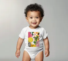 Una scena d'interni mostra una stanza vivace con pareti blu, piante rigogliose e un letto con un'audace coperta zebrata. La composizione è un mix giocoso ed elegante di motivi e colori vivaci, che crea un'atmosfera trendy ed energica.