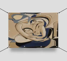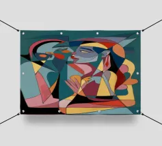 Un'astrazione geometrica composta da forme sovrapposte in toni freddi e caldi. La composizione gioca con lo spazio e il vuoto, invitando lo spettatore a interpretarne la tensione architettonica e lo spazio negativo dinamico.