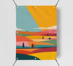 A beautiful landscape of rolling hills and fields, rendered in a colorful patchwork of greens, blues, pinks, and yellows, evoking a sense of idyllic countryside.