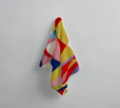 Un patchwork astratto di forme dipinte e strutturate in una tavolozza tenue di blu, ocra e beige crea una composizione sofisticata e ben bilanciata con un tocco artistico e artigianale.