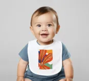 Foglie audaci e astratte nei toni caldi dell'arancio e del rosso sono stratificate su uno sfondo di forme blu, verdi e senape. La composizione mostra un vivace gioco di colori e forme organiche.