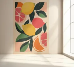 Questa colorata illustrazione presenta una vivace composizione di agrumi, tra cui limoni, pompelmi e una fetta d'arancia, circondati da foglie verdi. Il design luminoso e fresco cattura l'essenza dell'estate e aggiunge un tocco vivace a qualsiasi spazio.