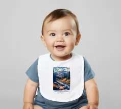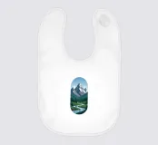 Un'illustrazione minimalista dal design piatto che cattura la bellezza di una valle di montagna. La scena è caratterizzata da maestose cime innevate che sovrastano un prato verde e rigoglioso, attraversato da un fiume tortuoso. I punti salienti includono fitte foreste di pini, un escursionista sulla riva del fiume e vivaci fiori selvatici, il tutto incorniciato in un'elegante capsula verticale. La tavolozza dei colori è moderna, dominata da blu freddi, bianchi e varie tonalità di verde.