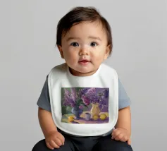 Una vivace composizione di natura morta con profumati lillà viola in un vaso blu intenso, accanto a un vaso blu più piccolo, mele verdi e limoni gialli, il tutto su un allegro sfondo giallo.