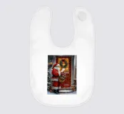 Un tradizionale motivo natalizio: Babbo Natale con cappotto rosso e sacco dei regali si trova davanti a una porta d'ingresso rossa, decorata con una ghirlanda, luci e regali. La delicata nevicata e i colori caldi creano un'atmosfera di festa nostalgica e piena di magia e gioia. Perfetto come immagine natalizia, poster di Babbo Natale, arte natalizia retrò, illustrazione invernale, arte murale festosa, idea regalo di Natale, arte natalizia nostalgica, decorazione natalizia, poster festivo, opera d'arte natalizia e accogliente decorazione domestica.