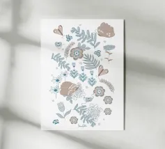 Delicate falene e farfalle che volano e si posano sui fiori. Foglie ondulate si intrecciano con spighe d'erba. È una scena immaginaria che ricorda una bella e calda giornata nella natura, rappresentata in una tavolozza di colori blu, grigio e beige.