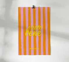 Il design combina la scritta verticale "Ciao" in giallo brillante con uno sfondo vivace di pennellate irregolari in arancione e rosa. Questa scelta cromatica ricorda i bar estivi sulla spiaggia, le tende da sole italiane e la spensieratezza della vita al sud.
