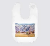 Maestose montagne innevate si ergono su una valle tranquilla e invernale; la luce nitida e la fresca tavolozza di bianchi, blu e gialli pallidi catturano la bellezza silenziosa e serena del paesaggio alpino.