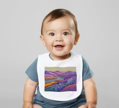 Morbide colline ondulate mostrano ricche sfumature di rosa, arancione e blu, mentre un cielo vibrante pieno di soffici nuvole esalta l'atmosfera tranquilla. Piccoli alberi punteggiano il paesaggio.