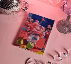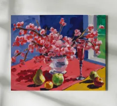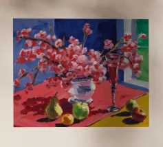 Un'audace natura morta con vivaci fiori rosso-rosa, forse papaveri o gerani, in un semplice vaso, accanto a fresche pere verdi, il tutto su una ricca tovaglia rossa che contrasta nettamente con uno sfondo blu intenso.