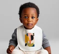 Una moderna composizione astratta mostra forme organiche e audaci nei colori rosso e blu, che si fondono con piccoli elementi neri e gialli su uno sfondo neutro.