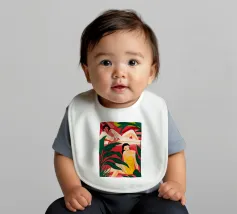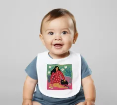 Un ritratto stilizzato di una donna con fluenti capelli scuri circondata da un'abbondanza di fiori e frutti colorati, che celebra la vita, la fertilità e la creatività.