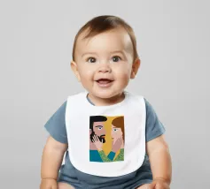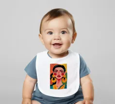 Questo dipinto raffigura una persona con i capelli neri che indossa un abito colorato con forme geometriche. Lo sfondo è rosso e la persona è adornata con grandi orecchini circolari.
