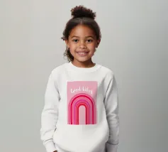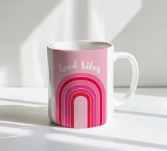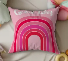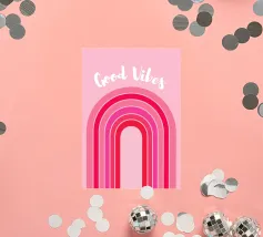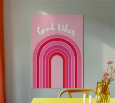 good vibes art, design arcobaleno rosa, estetica retrò, grafica allegra, messaggio edificante, stile minimalista colorato