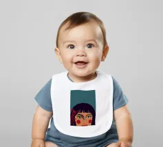 Un ritratto grafico di grande impatto di una donna con un'acconciatura nera e labbra rosse, con lo sguardo intenso rivolto all'osservatore, su uno sfondo colorato e astratto.