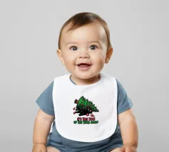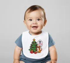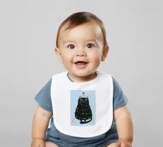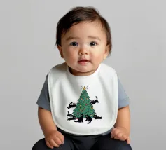 Un gatto nero che indossa un cappello da Babbo Natale è spiritosamente impigliato in luci natalizie colorate. Il testo accanto al gatto recita: "È abbastanza allegro?".