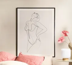 Un disegno minimalista che cattura la grazia tranquilla di una figura femminile vista da dietro. La sua silhouette, disegnata con un tratto continuo, evoca morbidezza, sicurezza e una tacita intimità. Un'elegante rappresentazione della forma femminile attraverso la semplicità e la fluidità.