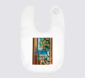 Una veduta dall'interno di una stanza rosa, guardando attraverso una finestra aperta con persiane blu un albero di arance. Il dettaglio del punto interrogativo aggiunge un tocco stravagante a questa scena vibrante e affascinante.