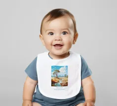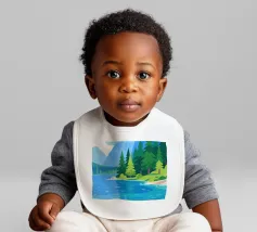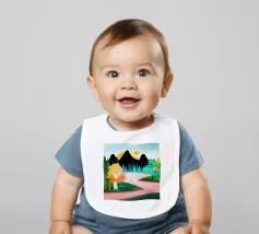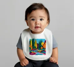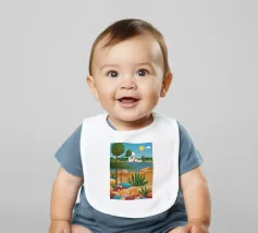 Raffigura un paesaggio tranquillo con uno specchio d'acqua in primo piano. Erbe alte e canne costeggiano l'acqua. Al centro, alberi dal tronco rosato e dal fogliame verde. Lo sfondo è caratterizzato da colline ondulate nei toni dell'arancione, del giallo e del verde, con un cielo blu e nuvole bianche in alto.