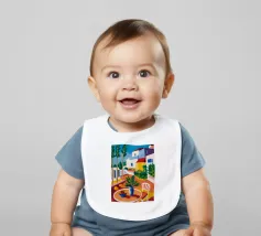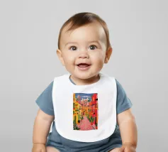 Una splendida natura morta di frutta fresca e bevande su un tavolo apparecchiato su un balcone, con una vista pittoresca di una classica città di mare del Mediterraneo. La scena è una fuga idilliaca e vibrante, che cattura perfettamente l'essenza di una vacanza sulla costa.