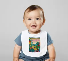 Una bella illustrazione di uno scaffale pieno di piante d'appartamento verdi e rigogliose, immerso nella calda luce del sole. La scena è un tributo sereno e gioioso alla bellezza di un giardino interno.